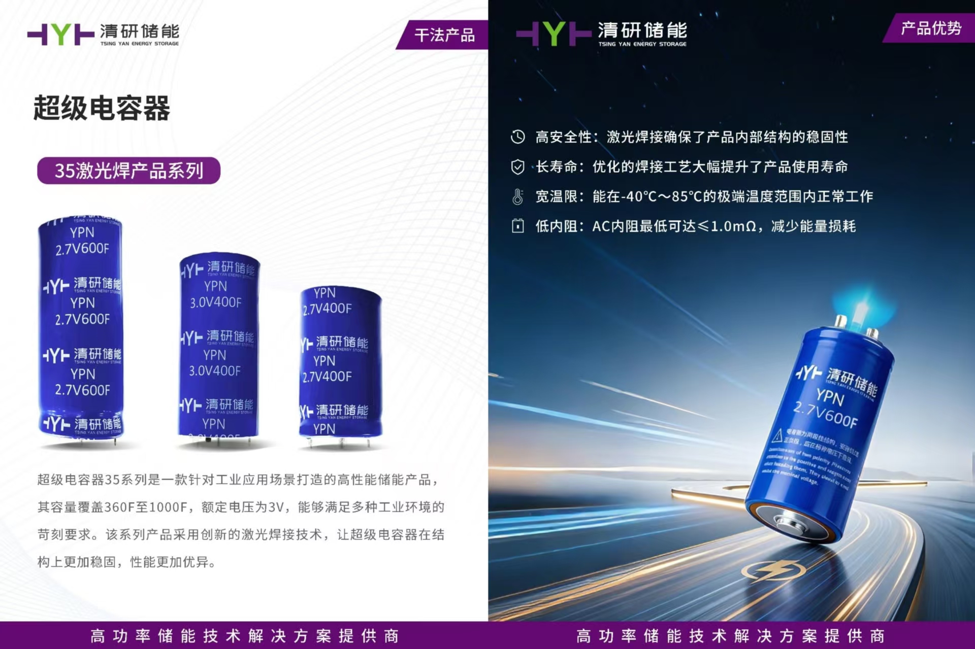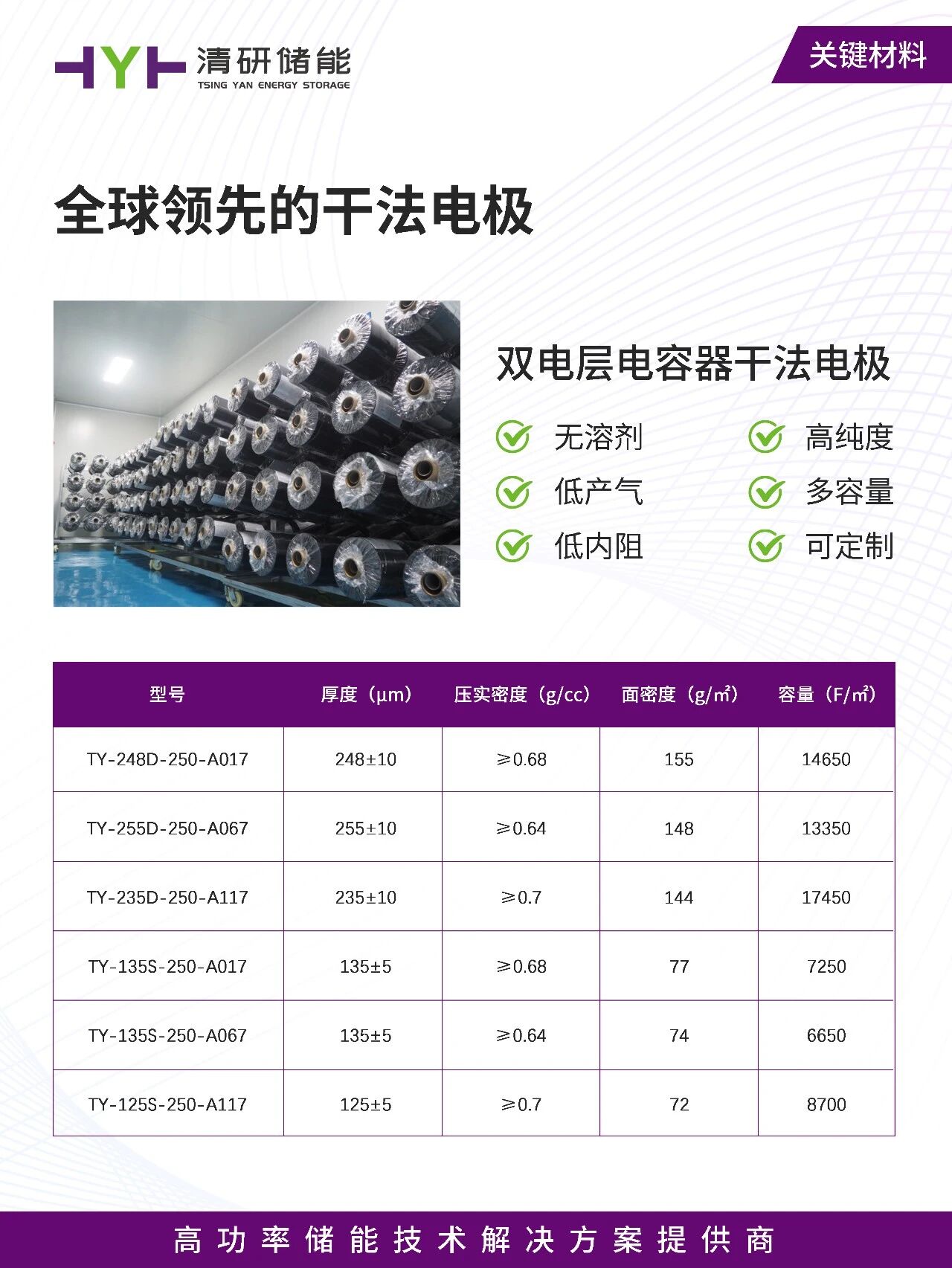 超级电容器35系列采用清研储能自主研发的双电层电容器干法电极,该材料具备无溶剂、高纯度、低产气、多容量、低内阻、可定制的特点。