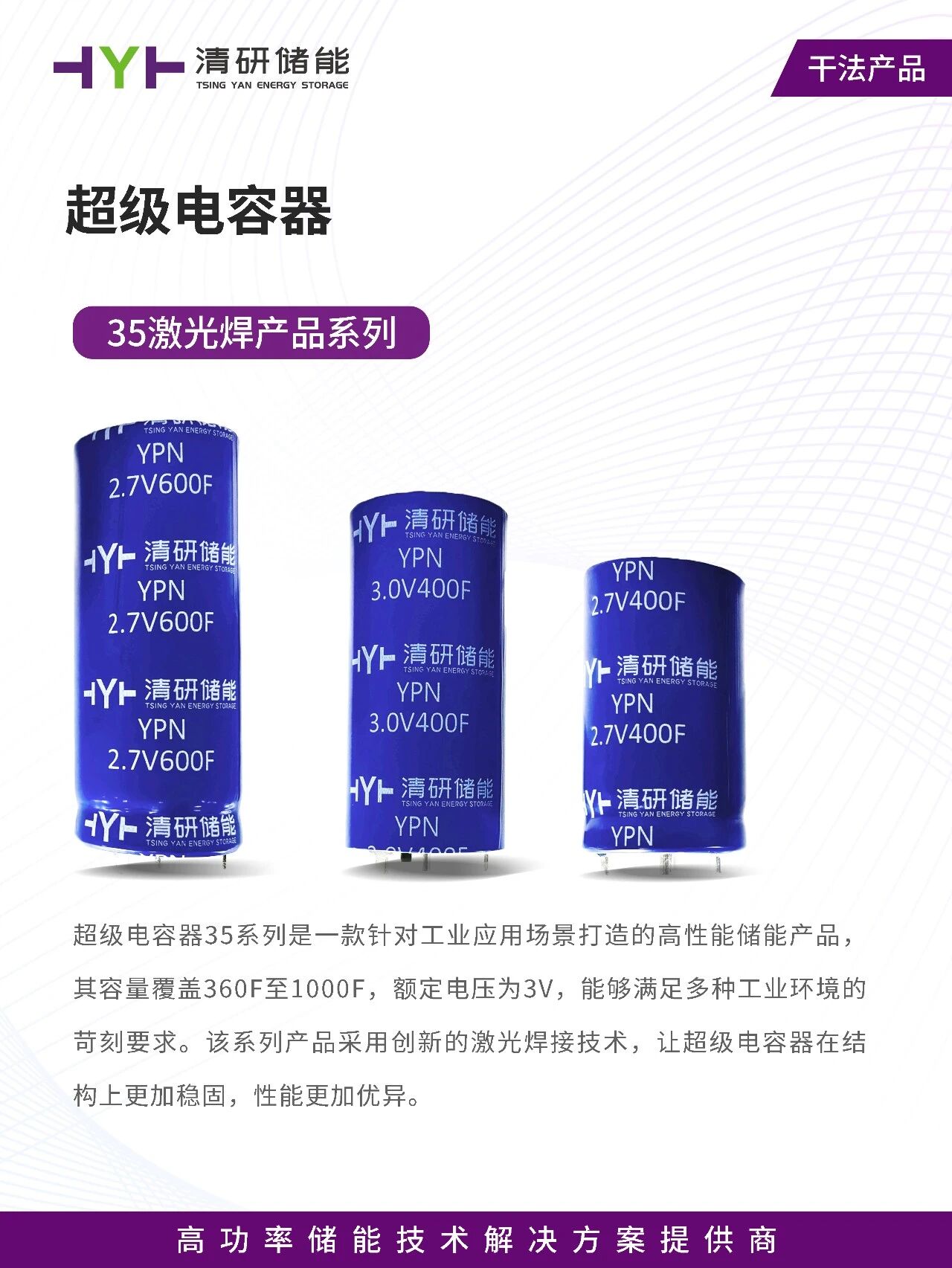 超级电容器35系列是一款针对工业应用场景打造的高性能储能产品,其容量覆盖360F至1000F,额定电压为3V,能够满足多种工业环境的苛刻要求。该系列产品采用创新的激光焊接技术,让超级电容器在结构上更加稳固,性能更加优异。